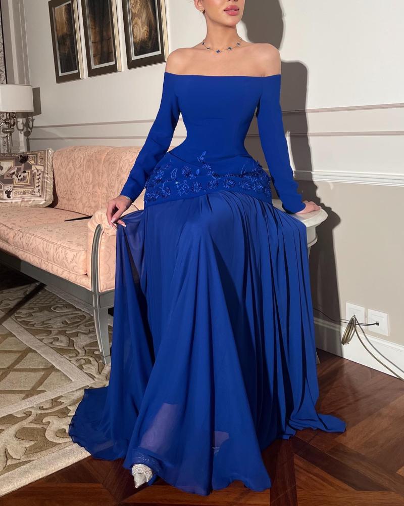 الفستان الظاهر في الصورة يتميز بتصميم أنيق وعصري ، وهو طويل يناسب المناسبات الرسمية والاحتفالات. يتميز الفستان بقصته الضيقة التي تعانق الجسم لتبرز القوام بشكل جميل، مع تفاصيل فريدة على الأكمام.