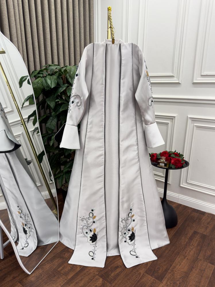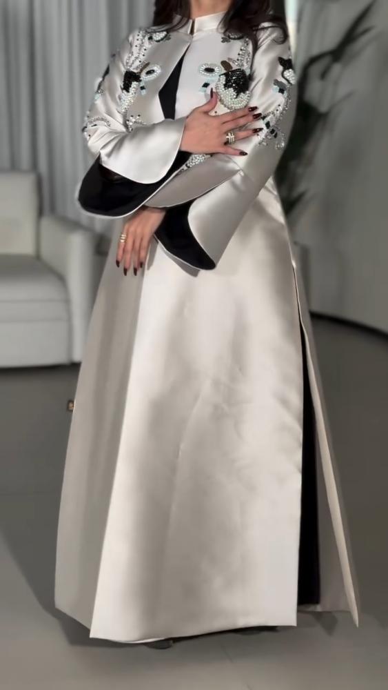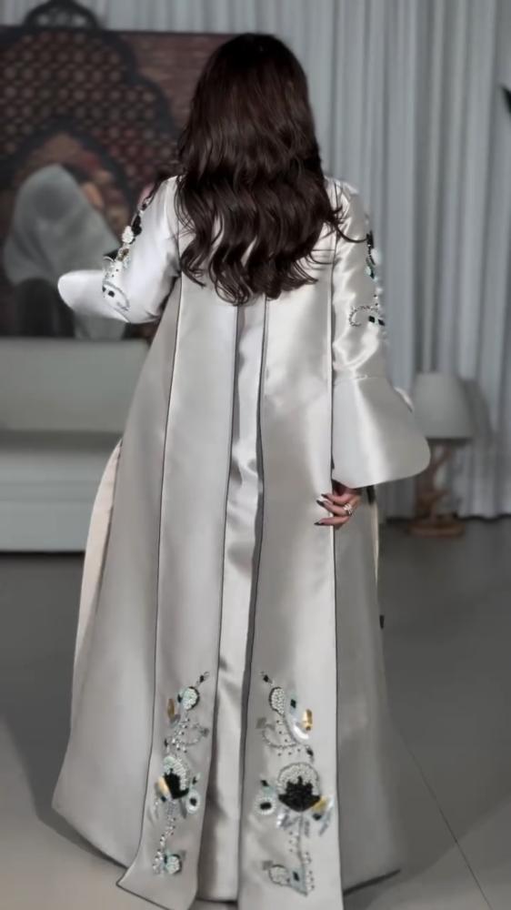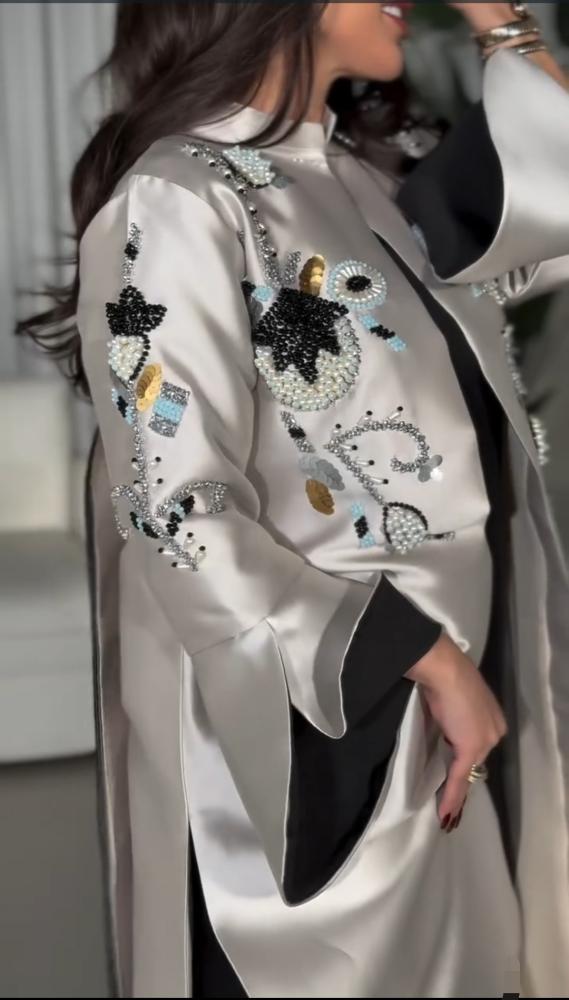 الأكمام الطويلة مصممة بأسلوب مفتوح مع أربطة متشابكة تضيف لمسة من الجرأة والجمال العصري، مما يجعله ملفتًا للنظر. في منطقة الخصر، يظهر تفصيل يجمع بين الانسيابية والبساطة، مما يعزز الأناقة ويبرز جمال الخصر.
