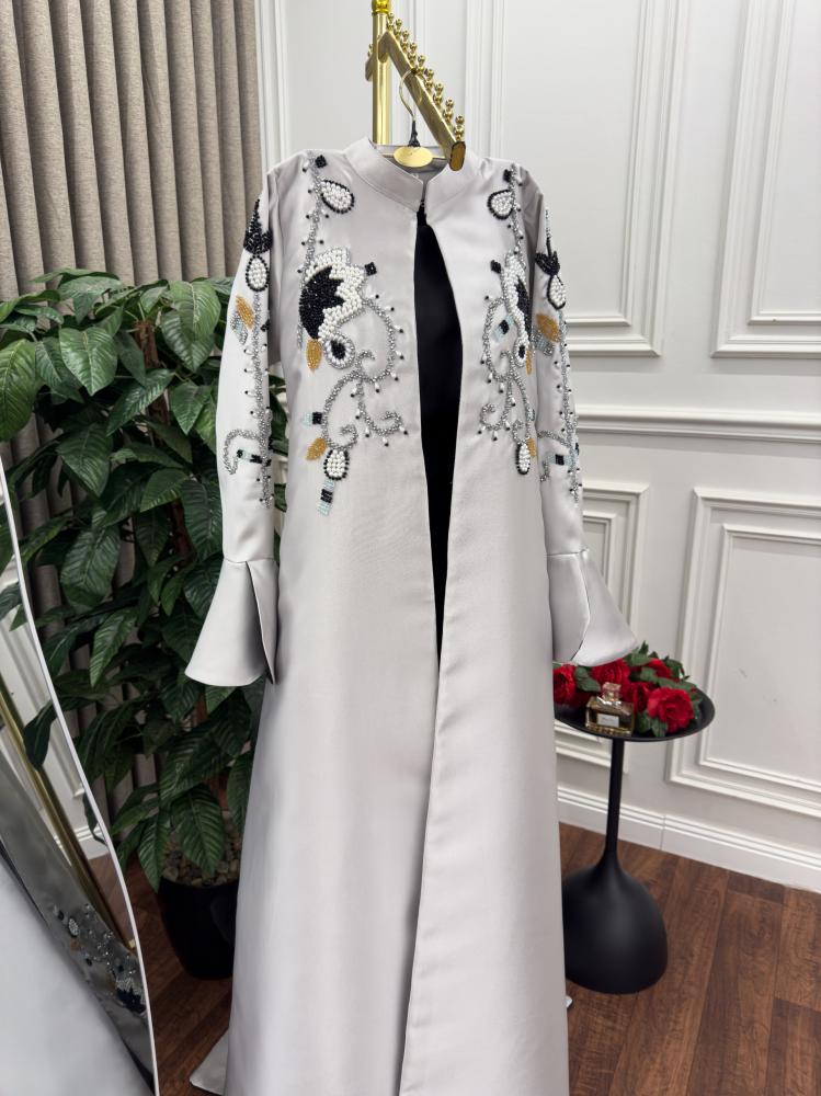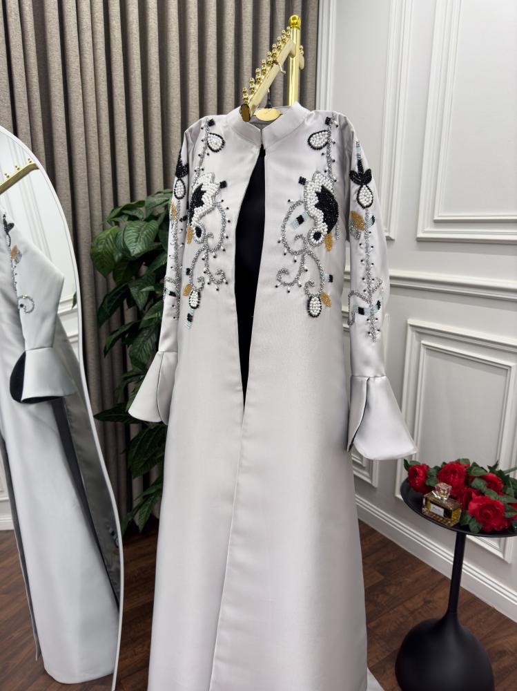 جديدنا وصل فستان انيق رصاصي عل اسود خامه ميكادو عل كريب استرتش