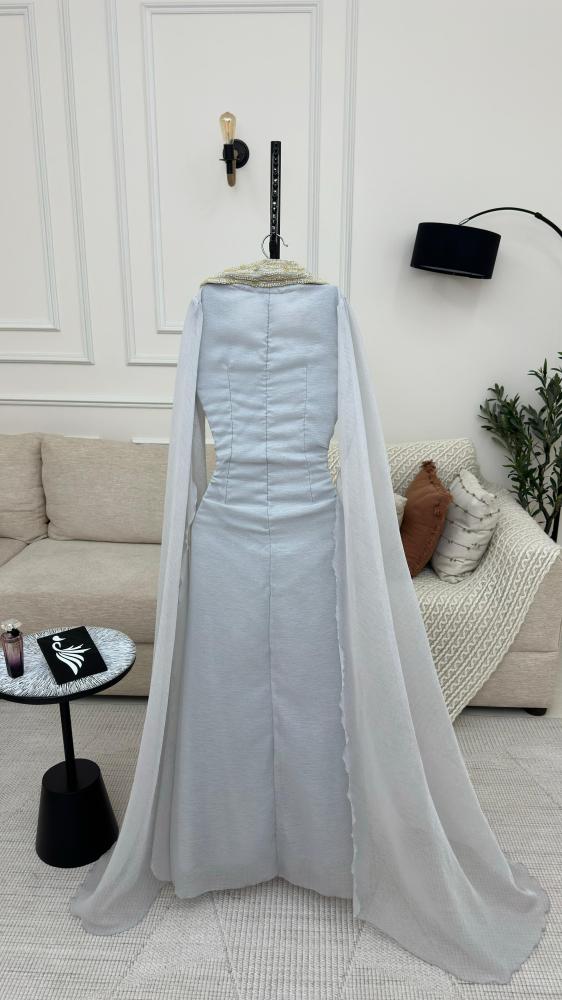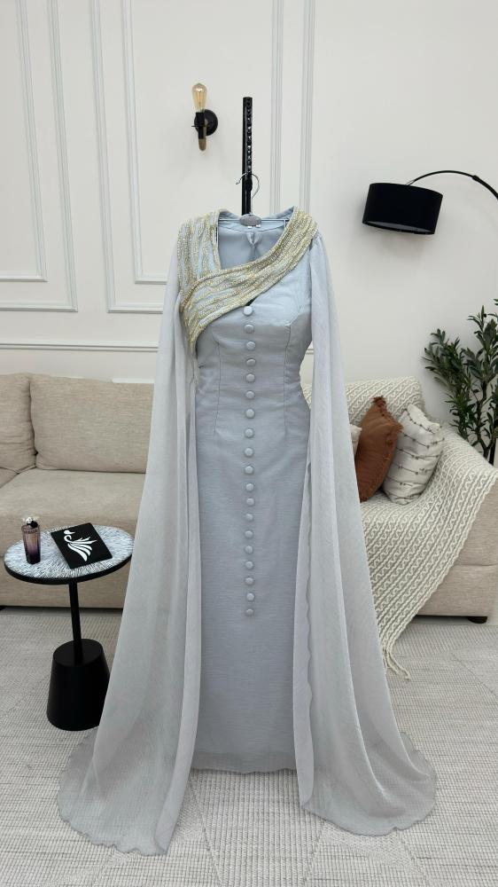 الفستان الظاهر في الصورة يتميز بتصميم أنيق وعصري ، وهو طويل يناسب المناسبات الرسمية والاحتفالات. يتميز الفستان بقصته الضيقة التي تعانق الجسم لتبرز القوام بشكل جميل، مع تفاصيل فريدة على الأكمام.