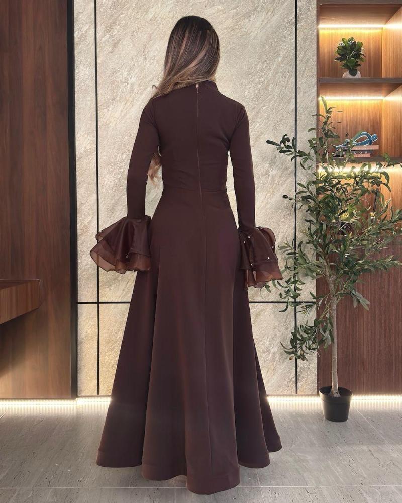 الأكمام الطويلة مصممة بأسلوب مفتوح مع أربطة متشابكة تضيف لمسة من الجرأة والجمال العصري، مما يجعله ملفتًا للنظر. في منطقة الخصر، يظهر تفصيل يجمع بين الانسيابية والبساطة، مما يعزز الأناقة ويبرز جمال الخصر.