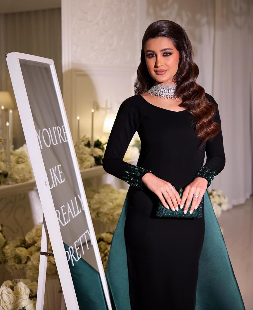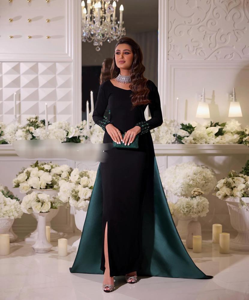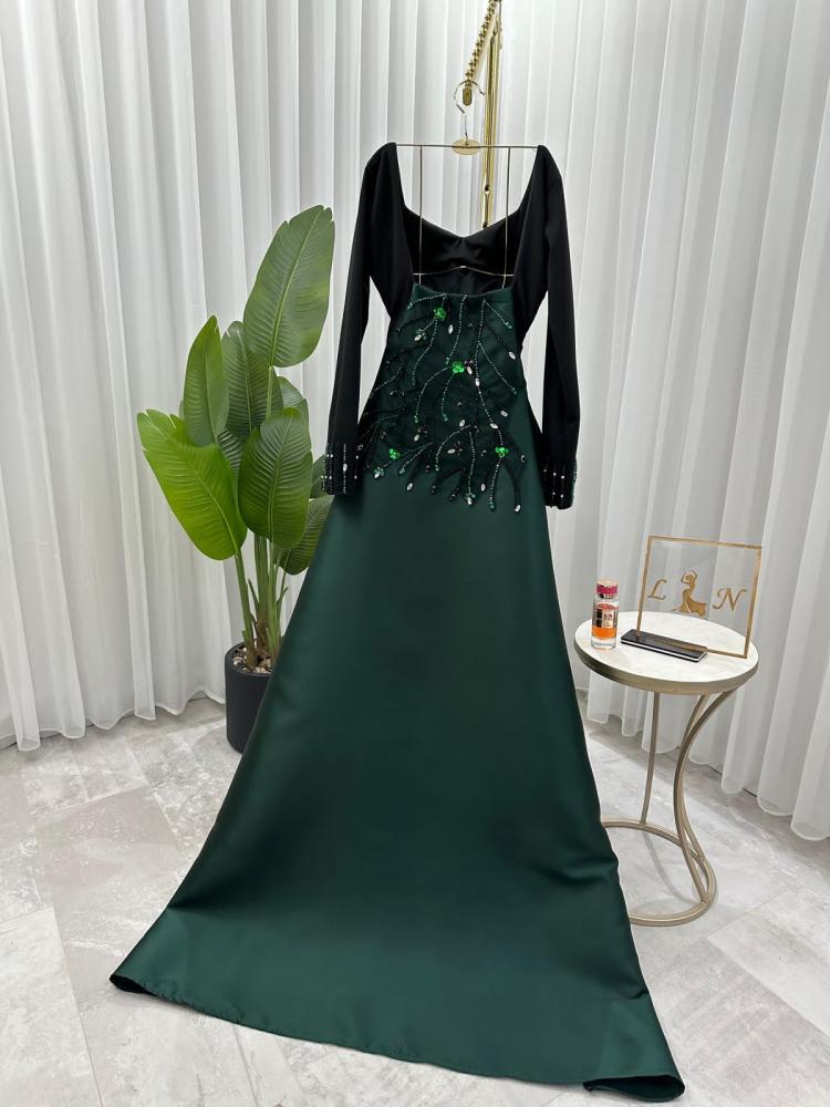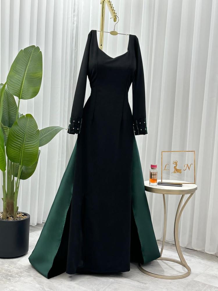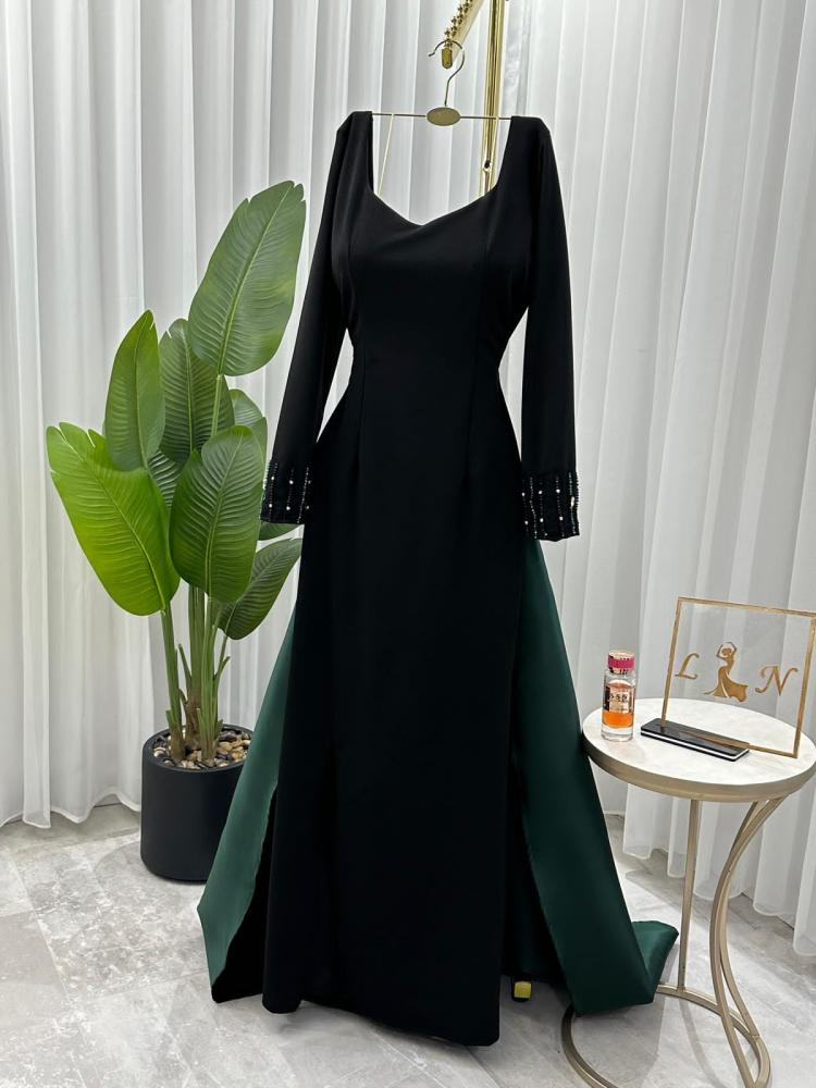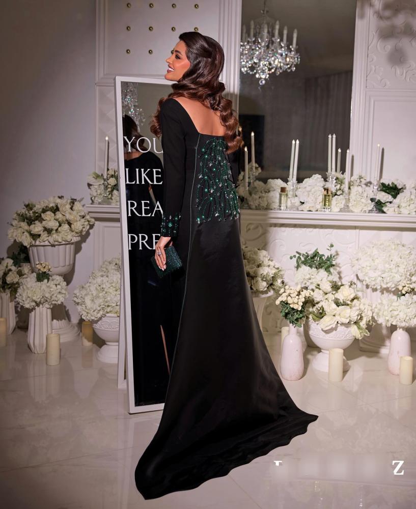 فستان سهره انيق طويل الخامه: ليكرا استرتش + ذيل ميكادو على تطريز يدوي