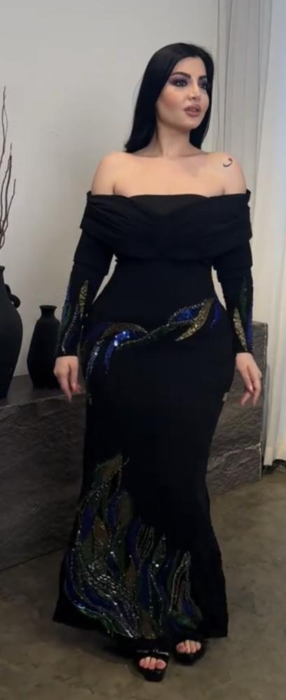 الفستان الظاهر في الصورة يتميز بتصميم أنيق وعصري ، وهو طويل يناسب المناسبات الرسمية والاحتفالات. يتميز الفستان بقصته الضيقة التي تعانق الجسم لتبرز القوام بشكل جميل، مع تفاصيل فريدة على الأكمام.