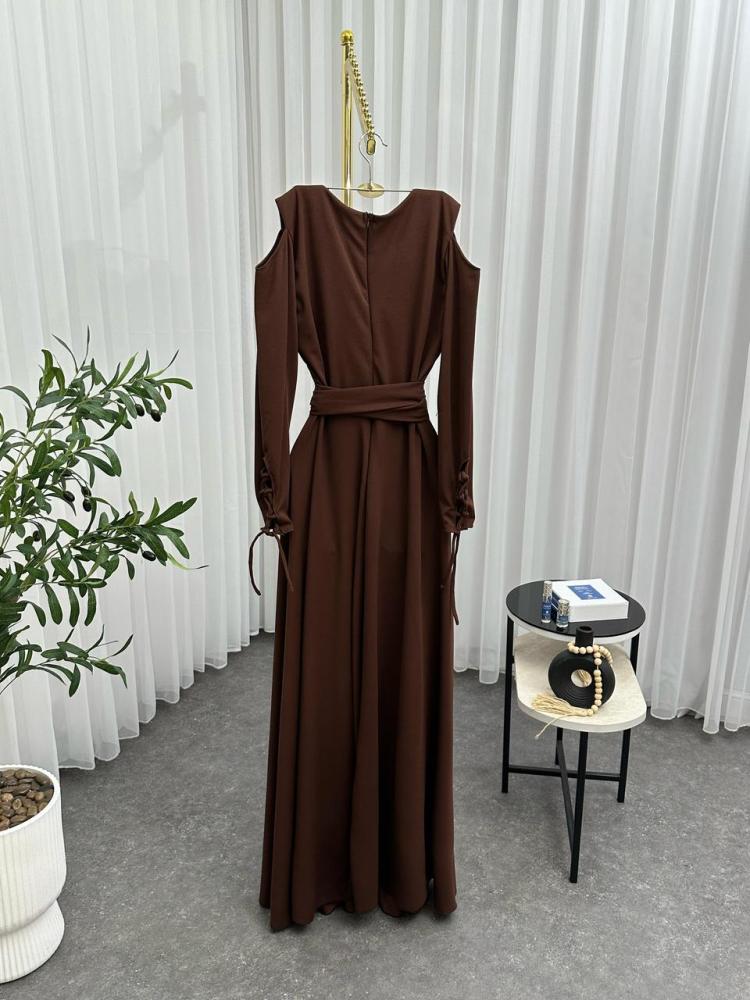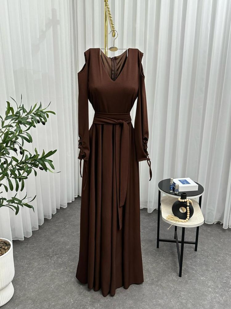 الأكمام الطويلة مصممة بأسلوب مفتوح مع أربطة متشابكة تضيف لمسة من الجرأة والجمال العصري، مما يجعله ملفتًا للنظر. في منطقة الخصر، يظهر تفصيل يجمع بين الانسيابية والبساطة، مما يعزز الأناقة ويبرز جمال الخصر.