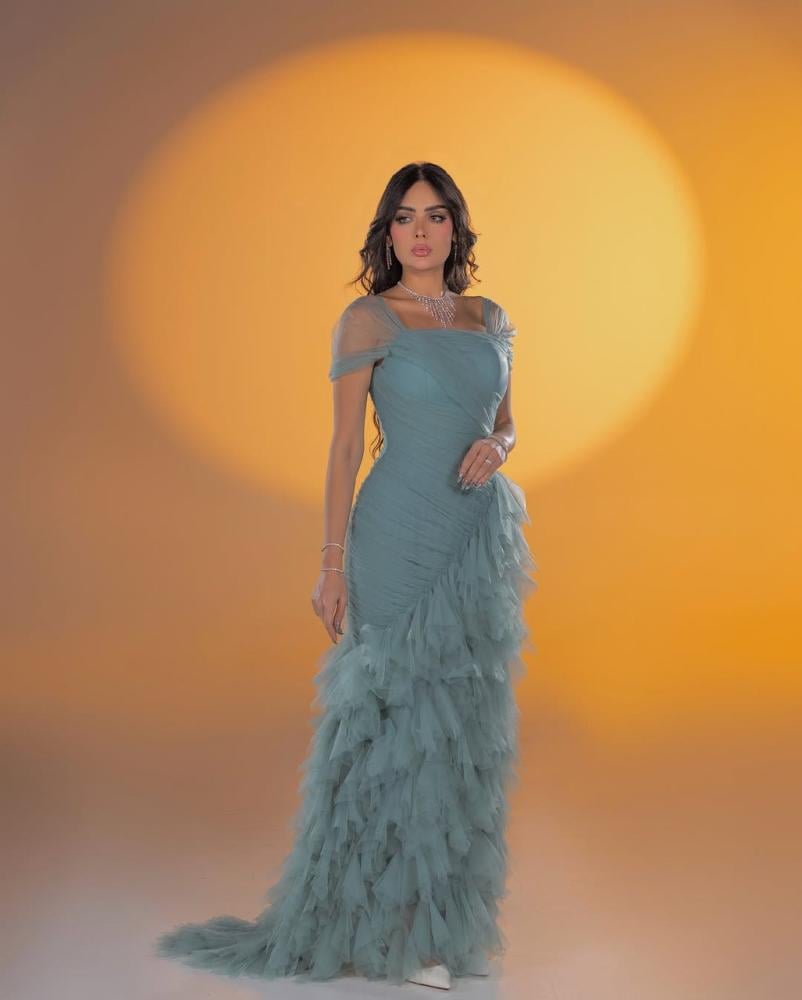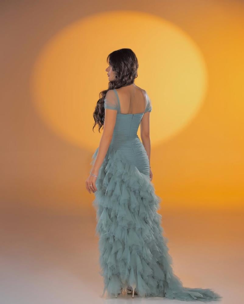 الجزء السفلي من الفستان منسدل بشكل انسيابي، مما يمنح الحركة راحة وأناقة. الإطلالة تكتمل بحقيبة صغيرة باللون الأبيض لتوفير تباين أنيق، مع اختيار تصفيفة شعر كلاسيكية تضيف لمسة من الفخامة والأنوثة.
