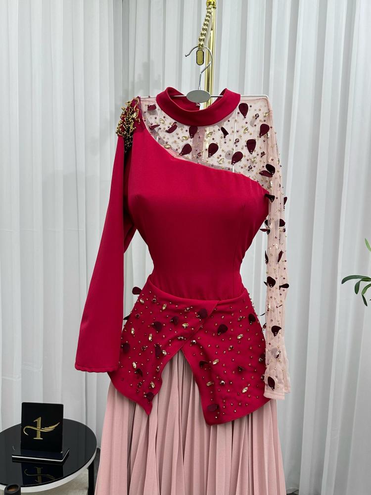 الأكمام الطويلة مصممة بأسلوب مفتوح مع أربطة متشابكة تضيف لمسة من الجرأة والجمال العصري، مما يجعله ملفتًا للنظر. في منطقة الخصر، يظهر تفصيل يجمع بين الانسيابية والبساطة، مما يعزز الأناقة ويبرز جمال الخصر.