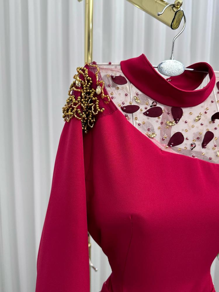 الفستان الظاهر في الصورة يتميز بتصميم أنيق وعصري ، وهو طويل يناسب المناسبات الرسمية والاحتفالات. يتميز الفستان بقصته الضيقة التي تعانق الجسم لتبرز القوام بشكل جميل، مع تفاصيل فريدة على الأكمام.